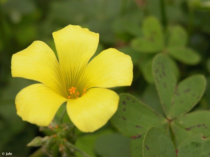 Hierba perenne, de raíz profunda, blanquecina, poco ramificada y salpicada de pequeños tubérculos o bulbillos. Hojas trifoliadas con lóbulos acorazonados –que recuerdan a las de los tréboles– verdes, en ocasiones con máculas dispersas de forma irregular, parduzcas-negras, más o menos numerosas; peciolo de hasta algo más de 20 cm. Tallos floríferos sin hojas, rematados en inflorescencia umbeliforme, de numerosas flores, acampanadas, erectas, de cinco piezas soldadas en la base, amarillas. No fructifica.