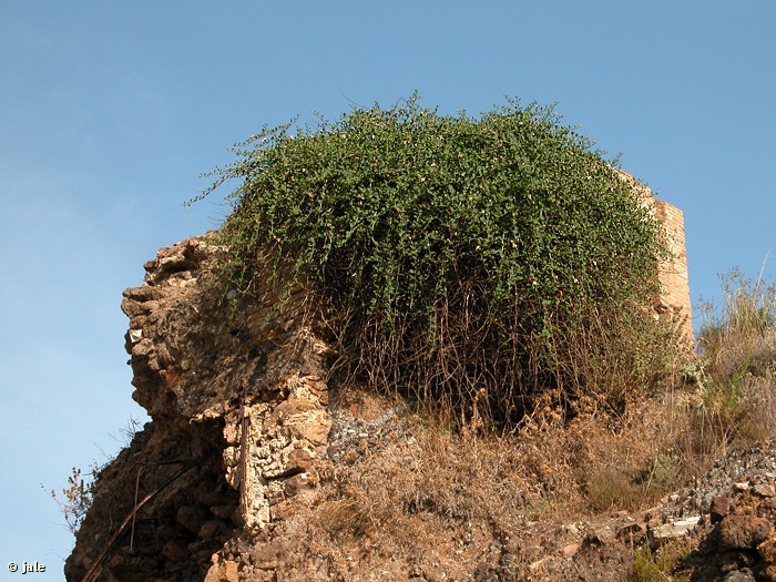 Paredes y muros, rocas, terraplenes de pendiente pronunciada, a menudo junto a edificaciones mineras abandonadas (pozos, hornos de calcinación, etc.) y viejos caminos que conducían a las minas, en la actualidad también en cunetas de carreteras, incluso en algunas relativamente recientes, hasta en taludes de modernas vías de comunicación (como en el nudo de autovías AP 7, CT 32 y RM 12). Planta de distribución mediterránea, presente en Europa sólo en España y Grecia. En la Península Ibérica está restringida a la Región de Murcia, en la que se localiza la única población conocida en territorio peninsular, en el entorno de la ciudad de Cartagena, principalmente en la franja de sierras litorales denominadas en su conjunto Sierra Minera y especialmente en enclaves desde el Monte San Julián al Llano del Beal (localidad clásica). Son poblaciones destacadas, por número de efectivos, las que cuentan con más de 50 individuos, en los montes de San Julián y El Calvario, en las proximidades de la ciudad de Cartagena y, hacia el este, en el entorno de los pueblos de Alumbres y Llano del Beal. También, por posición perimetral en el área de distribución en la Región de Murcia y, por tanto, constituyentes de avance natural de la especie, destacan las localidades de Cabo de Palos (en cantera abandonada), Los Nietos (final de rambla minera) y autovía AP 7 (terraplenes de gran obra viaria relativamente reciente).