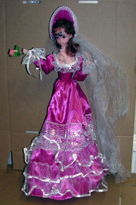 Presenta riesgo de asfixia y lesión. Las piezas pequeñas (pendientes, sombrero y cuenta en el vestido delantero) se pueden separar, con el peligro de que los niños los traguen. Las cuentas presentan puntos agudos accesibles que podrían producir pinchazos en la piel. El bolso de plástico que incluye no está perforado. La muñeca no se atiene a la Directiva de Juguetes, las normas europeas y los requisitos de etiquetado de CE.