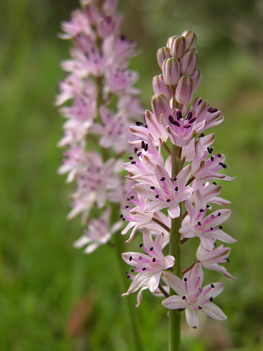 Planta herbácea, de porte grácil. Bulbo subterráneo, cubierto de varias capas delgadas de una túnica pardusca; se encuentra por lo general próximo a la superficie, rara vez por debajo de los 15 cm. Tallo de hasta 35 cm. de longitud, erecto, glabro, de color verde oscuro. 5-6 hojas basales, en roseta, de oblongas a oblongo-lanceoladas, de extremo redondeado, pero con terminación aguda, que comienzan a desarrollarse finalizando la floración. Inflorescencia de tipo espiga, densa, de hasta 10-15 cm., con flores numerosas. Piezas florales en número de seis, tépalos violáceos, estambres con filamento de 2-3 mm de longitud, rematados en anteras de color violeta intenso, casi negras. Ovario de 3-4 mm. de longitud, sentado, con estilo corto, sin estigma aparente. Fruto de tipo cápsula, que contiene numerosas semillas negras, de 0,5 mm. de diámetro.