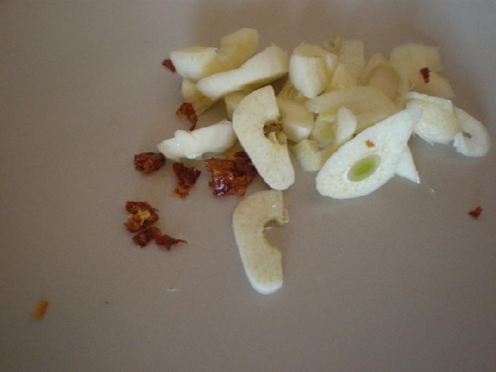 Pelaremos el diente de ajo que también cortaremos en láminas. La guindilla la cortaremos en trocitos, ya sabemos que haciendo esto daremos mucho más sabor a la comida que si la dejáramos entera.
