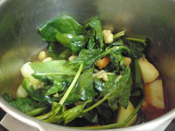 Y mientras se cuece levemente lo anterior, limpiamos las espinacas, las lavamos y echamos en la sartén donde hemos hecho el sofrito. Cuando pierdan un   poco el agua, las echamos a la olla.