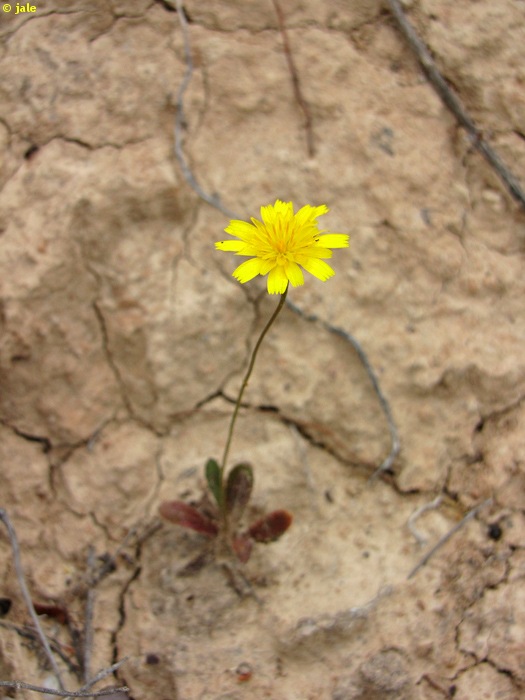 Planta anual, de porte grácil, hasta 10-12 cm de altura. Raíz axonomorfa, corta. Hojas todas en roseta basal, oblongo-lanceoladas, por lo general enteras, de extremo romo y glabras, con frecuencia algo lobuladas y con pelos, verdes oscuras, que tienden a tonalidades parduscas durante la floración. Tallo único, no ramificado, erecto, glabro, pardusco-marrón. 25-30 flores, todas liguladas, amarillas, en capítulo de 0,8-1,4 mm de diámetro. Fruto tipo aquenio, con vilano.