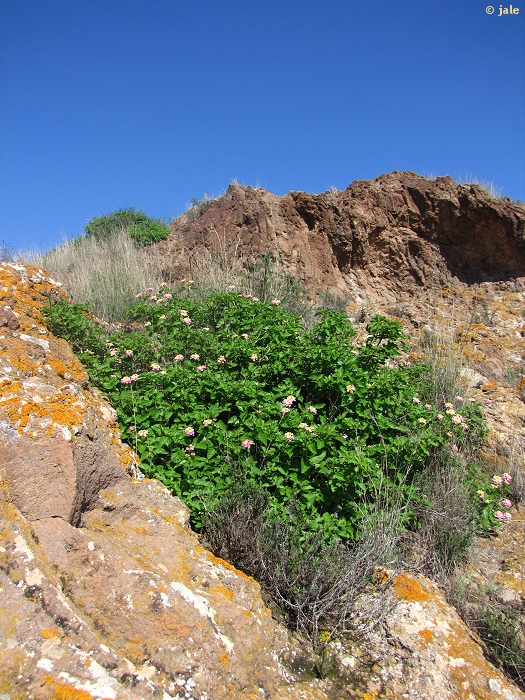 La bandera española (Lantana camara) es una planta frecuente en los espacios ajardinados de las ciudades de la mitad sur de la Región, donde la temperatura no baja nunca de los 5º C, ya que no tolera heladas. Aunque en Murcia escapa de forma muy ocasional de su cultivo, y suele hacerlo en lugares próximos, como escombreras y terrenos abandonados, algunos ejemplares pueden verse en zonas naturales. En el Monte El Carmolí, por ejemplo, crecen naturalizados varios ejemplares, algunos de algo más de un metro de altura, en ecología similar a la preferida por Whitania frutescens, con la que convive, desarrollándose, floreciendo y fructificando sin problemas.