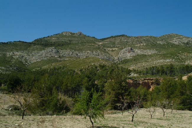 Para encontrar la senda hay que ir a la derecha 100 metros por el borde de los bancales y entonces la senda parte ascendiendo diagonalmente a la izquierda, hasta salir al collado que forman las dos cumbres del cerro. Se tarda 15 mino en subir.