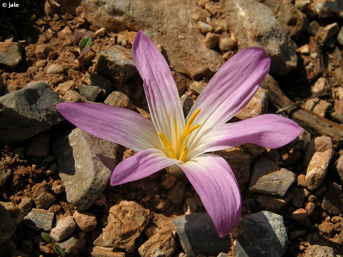 Bulbosa de hasta 10 cm de altura. Órgano subterráneo de 2-3 cm de ancho, cubierto de una túnica padusca muy oscura. Hojas lineares, de 5-7 cm de largo, muy estrechas y algo plegadas, por lo general ausentes durante la floración, a lo sumo en estado de desarrollo incipiente cuando ésta. En otoño, cada planta produce a ras del suelo una única flor, de seis piezas rosadas, blanquecinas en la base. Fruto de tipo cápsula.