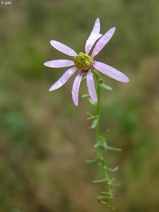 Hierba perenne, de tallos finos y erectos, ramificados, más en la parte superior, algo leñosos y rígidos, pero también algo flexibles, de hasta 60 cm. Hojas lineares o linear-lanceoladas, con glándulas, las inferiores por lo general secas durante la floración. Inflorescencias de tipo capítulo, agrupadas de forma corimbosa. Flores exteriores con lígulas alargadas, de hasta 1 cm, azuladas, violáceas, presentándose espaciadas entre si y distribuidas irregularmente. Flores tubulosas amarillas, con órganos sexuales (estambres y estigma) muy exertos. Fruto en aquenio.