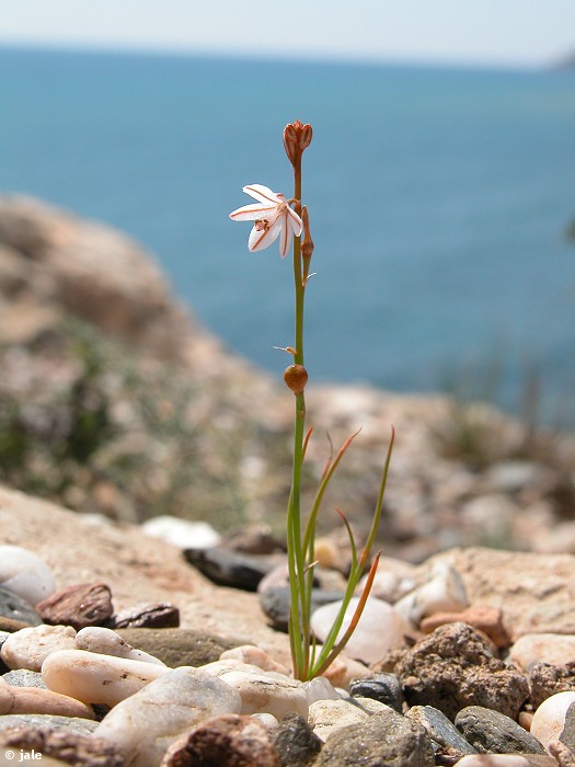Hierba perenne, en ocasiones bienal, de tallos erectos, de hasta 40-50 cm. Hojas en roseta basal, numerosas, de sección circular, huecas, con estrias longitudinales, por lo general lisas, aunque algo papilosas, sobre todo en los márgenes, de hasta 30 cm de longitud. Flores blancas, de 13-15,5 mm de diámetro, en inflorescencia racemosa, abierta, relativamente laxa, que asemeja estar articulada, de tallos lisos, cubiertos de una fina capa cérea. Tépalos blancos, ovado-lanceolados, con línea longitudinal pardusca-anarajanda en haz y envés. Ovario peloso, filamentos blancos, algo engrosados, anteras pardusco-anarajandas. Fruto de tipo cápsula, subesférica, de 5-7 mm de diámetro.