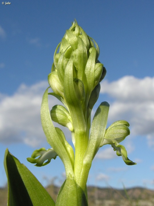 Hierba robusta, glabra, con 2-3 tuberculos, relativamente grandes. Tallos de hasta 80 cm, verdes, teñidos de púrpura en su tercio superior. Hojas mayoritariamente basales, de hasta 25 cm de longitud y 6 cm de ancho, en grupos de 4-6. Algunas, caulinares, abrazando al tallo, erectas. Inflorescencia en espiga densa, de hasta 40 cm de longitud, con numerosas flores, de 2.5-3 cm de longitud. Sépalos verdes, con manchas y trazos purpúreos en su cara interna, conniventes con los pétalos, similares, en una estructura a modo de capuchón. Labelo 15-20 mm, rosado-violáceo con manchas púrpuras, margen lobulado, lóbulos laterales falciformes, lóbulo central bífido, espolón 5-6 mm de longitud. Fruto en cápsula.