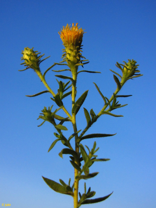 Hierba perenne de hasta 40 cm de altura, con cepa rizomatosa, algo leñosa o lignificada, incrustada en la roca, de la que parten y se ramifican varios tallos, erectos, verdes, cubiertos de pelos, la mayoría glandulosos. Hojas numerosas, laxas, dispuestas de forma alterna y opuesta a lo largo del tallo, lanceoladas, algo oblongas, sin peciolo, de hasta 3 cm de largo, con frecuencia algunas secas o parcialmente secas. Flores en capítulos, a su vez agrupados en panícula corimbiforme. Brácteas del involucro en 4-6 filas, lineares, con pelos largos y glándulas, de 9-12 mm, curvadas hacia afuera en su extremo; flores todas flosculadas, amarillas. Fruto de tipo aquenio, de hasta 3 mm, con vilano doble, de 6-8 mm.