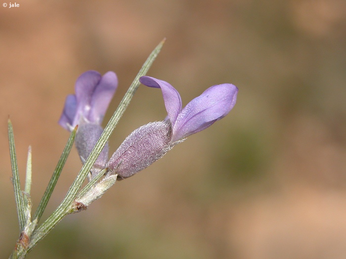Pequeño arbusto perenne, de hasta 60-70 cm de altura, de porte almohadillado, muy ramificada desde la base, con ramas intrincadas y compactas, verdes, glabras en la madurez, estriadas, erectas o erecto-patentes, rematadas en espina fuerte, punzante. Hojas entremezcladas en la maraña de ramas, dispuestas de forma opuesta, compuestas, con peciolo corto y raquis largo, de foliolos reducidos, de oblongos a lanceolados, con extremo romo y base atenuada, seríceos, plateados. Flores mayoritariamente en número de dos, opuestas entonces entre sí, o bien en verticilos de 3, raramente 4, de color azul violáceo, con cáliz de aspecto inflado, cubierto de pelos blanquecinos. Fruto de tipo legumbre, oblonga, con 3-6 semillas.