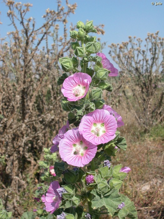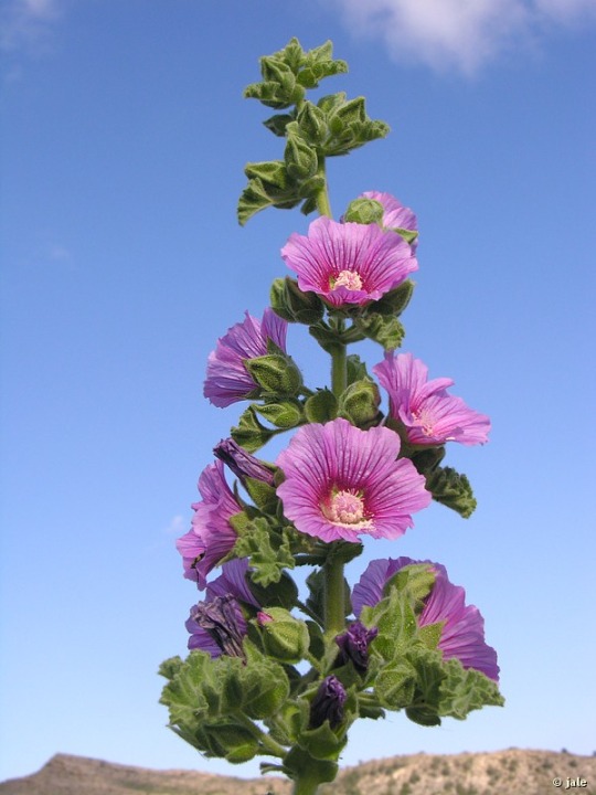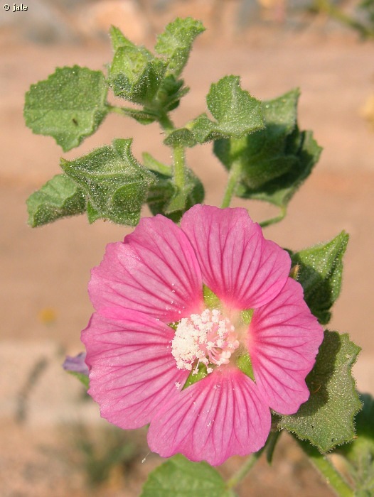 Hierba alta, de hasta algo más de 1 m de altura, que rebrota varios años de cepa. Tallos erectos, más o menos ramificados a distintas alturas, tomentosos, cubiertos de pelos, mayoritariamente estrellados, también fasciculados o simples, muchos de ellos glandulíferos, que secretan una sustancia aceitosa al tacto. Hojas de hasta 6 cm de diámetro mayor, suborbiculares, cordadas, con el margen de crenado a dentado, algo ondulado, muy tomentosas, glaucas, pecioladas, con estípulas amplexicaules, caedizas. Flores de simetría radial y tres verticilos de tres y cinco piezas, dispuestas en las axilas, en fascículos de hasta 4 flores, con pedúnculos más cortos que los peciolos de las hojas. Epicáliz de tres piezas ovadas anchas, soldadas en la base, situadas por debajo de los cinco sépalos del cáliz, oval-lanceolados, agudos, persistentes en la fructificación. Pétalos de hasta 40 mm, rosado-violáceos, obovados, truncados, de margen lobulado-ondulado y nerviación ramificada hacia el exterior, de color más intenso, púrpura. Fruto en esquizocarpo, con mericarpos en ocasiones pelosos.