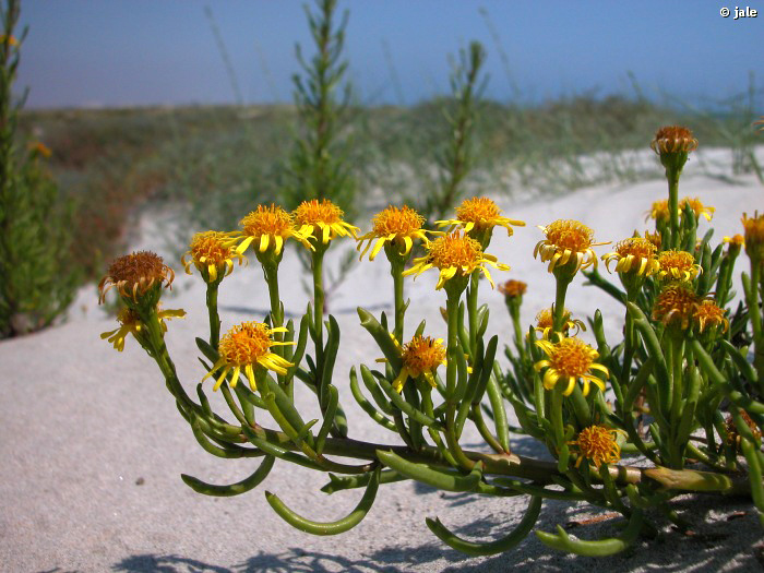 Pequeño arbusto de hasta 80 cm-1 m de altura, glabro, sin glándulas. Tallos erectos, ocasionalmente postrados, leñosos, con hojas simples, lineares, alternas, carnosas, dispuestas en fascículos axilares, de hasta 5 cm de longitud, estrechas, no mayores de 0,5-0,7 cm de ancho. Flores amarillas en inflorescencia de tipo capítulo, pedunculado, solitario o en grupos corimbiformes, las externas hemiliguladas, sólo femeninas, con lígula linear, las interiores flosculosas, hermafroditas. Fruto en aquenio pubescente, de hasta 3 mm, con vilano de 4-5 mm, también peloso.