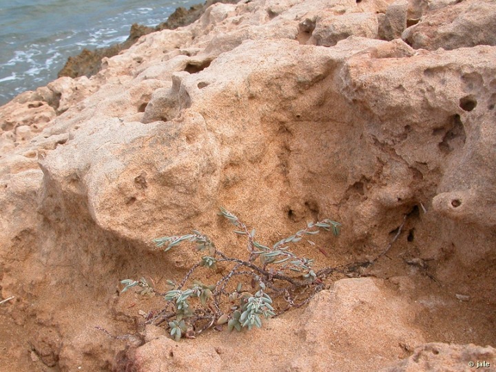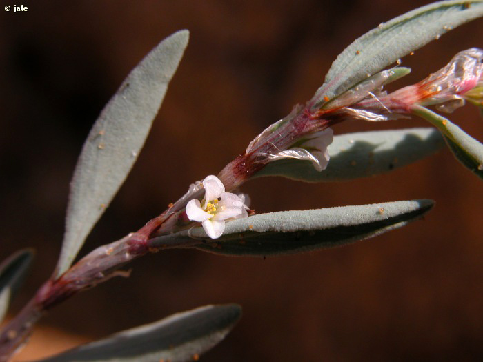 Planta perenne, sufruticosa, cubierta de papilas. Tallos postrados, ramificados, las ramillas jóvenes ascendentes, erectas, las ramillas viejas sin hojas, algo leñosas, parduscas. Hojas lanceoladas, de hasta 2,5 cm, sin peciolo, o con peciolo muy corto, nada aparente, carnosas, verde grisáceas, con el margen revuelto hacia atras y nervios marcados en el envés. Estípulas soldadas en la base de las hojas, dando lugar a una estructura que rodea al tallo, la ócrea, membranosa, transparente, laciniada, con estrias rojizas. Flores axilares, solitarias o en grupos de 2-4, con cinco piezas soldadas, blancas o algo rosadas y 8 estambres. Fruto de tipo aquenio.