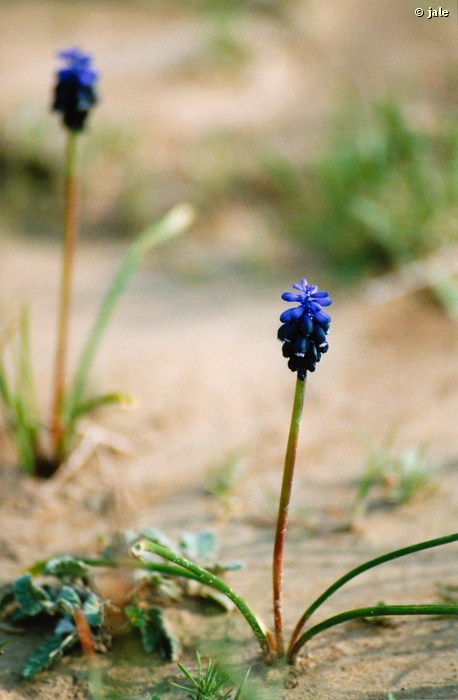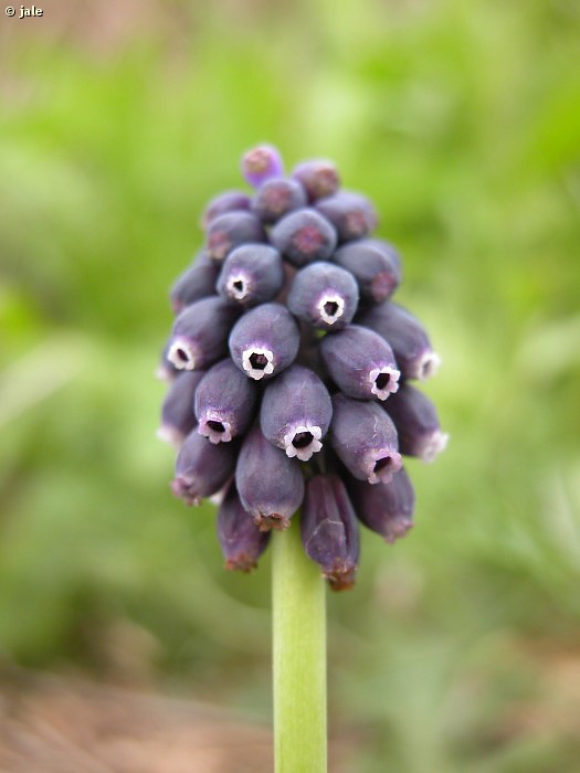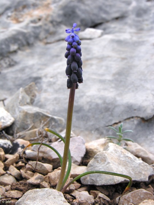 Hierba perenne, glabra, de hasta 20 cm, con bulbo de 1,2-1,8 cm, de tunica pardo oscura, casi negra, y numerosos bulbos pequeños, en la base. Hojas en roseta basal, de hasta 20-30 cm de longitud, postradas en el suelo o sobre las plantas cecanas, retorcidas, con frecuencia cortadas por ramoneo, lineares, acanaladas, de color verde oscuro. Escapo rematado en inflorescencia de tipo racimo, corto, compacto, con flores numerosas, ovoideas, subglobosas, azules todas hermafroditas, salvo las terminales, estériles, cerradas, de menor tamaño que las inferiores, fértiles, con seis dientes blanquecinos en su extremo. Fruto en cápsula, semillas negras.