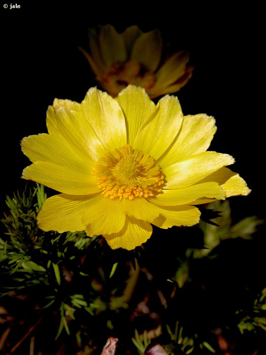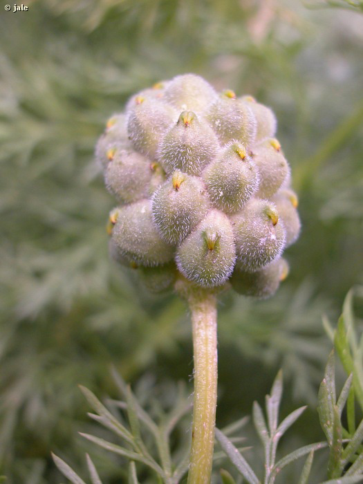 Hierba perenne, de raíces numerosas, gruesas, tanto que asemejan tubérculos. Tallos erectos, de hasta 40 cm, ramificados desde la base o en su parte media, con hojas regulamente repartidas, en disposición alterna, dos veces pinnatisectas, con lobulos lineares, sin peciolo, algo envainadoras, las de la parte inferior diferentes, sólo con vainas. Flores de hasta 6 cm de diámetro, con más de 10 pétalos, de color amarillo intenso, y de numerosas anteras amarillas. Fruto con aspecto de cabezuela, formado por varios aquenios de pico uncinado.