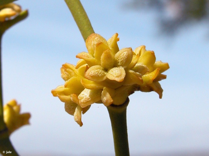 Pequeño arbusto dioico y hemiparasito, por lo general de hábito colgante y globoso. Tallos muy ramificados, en varias ramas por nudo, y también de forma dicotómica, de sección cilíndrica, con hojas opuestas, flexibles, coriáceas, de lineares a elípticas, al menos cuatro veces más largas que anchas, que tienen color verde amarillento y extremo redondeado. Flores masculinas y femeninas, axilares o terminales, de cuatro piezas triangulares. Fruto de habitualmente hasta 1 cm de diámetro, globoso, blanco o ligeramente amarillo, con endospermo viscoso.