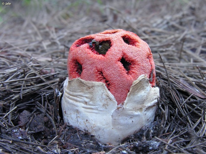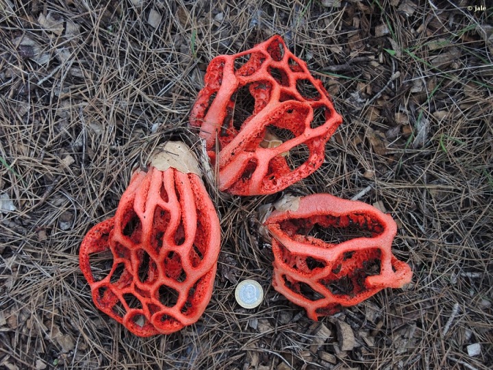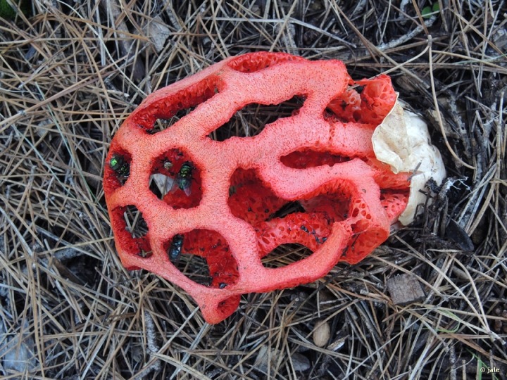 Es precisamente la pestilencia del cuerpo fructífero, desprendida por la gleba, unida a la forma y coloración rojiza de la estructura, una estrategia muy elaborada para la dispersión de sus esporas, hasta tal punto que para las moscas es tan atractiva como la carne putrefacta y en descomposición, siendo continua e incesante la visita de estos insectos, habituales sobre la malla y adentrándose en su interior, que veremos casi con total seguridad (salvo al caer la tarde) si tenemos la suerte de localizar uno de estos raros hongos.