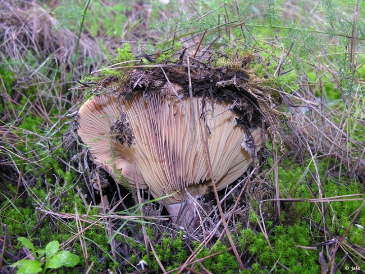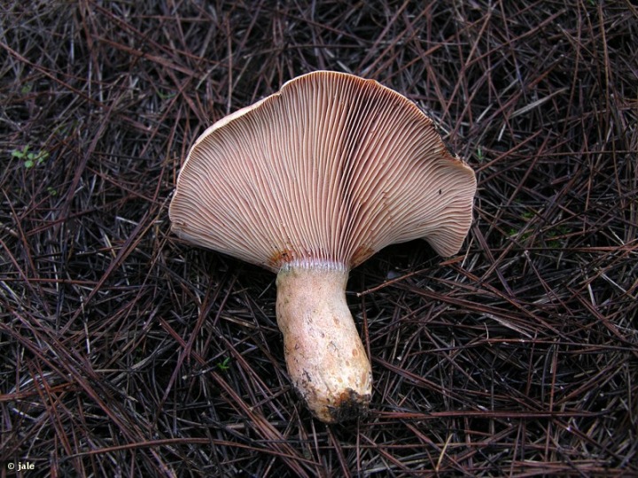Hongo con seta comestible, de carne espesa, coloración rojiza-anaranjada, a veces pálida o de tonos verdosos, y relativamente grande, de hasta 15 cm de altura. Pie cilíndrico y céntrico, sin volva, ni anillo, que se rompe como una tiza al partirlo, de 5-8 cm de longitud, con algunas manchas redondeadas características, dispersas. Sombrero cóncavo, a veces algo aplanado, hundido o de aspecto embudado, redondeado, de margen algo revuelto, grande, de aproximadamente 15 cm de diámetro. Himenio con láminas numerosas, decurrentes (que descienden del sombrero sobre el pie) y esporada ocre.