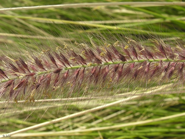 Hierba perenne, de más de 1 m de altura, con macollas muy pobladas de hojas, de sección cilíndrica, por el limbo enrollado, de 30 y hasta 40 cm de longitud. Inflorescencia de tipo panícula, espiciforme, alargada, de coloración púrpura y aspecto plumoso. Fruto seco e indehiscente, de tipo cariópside, oblongo.