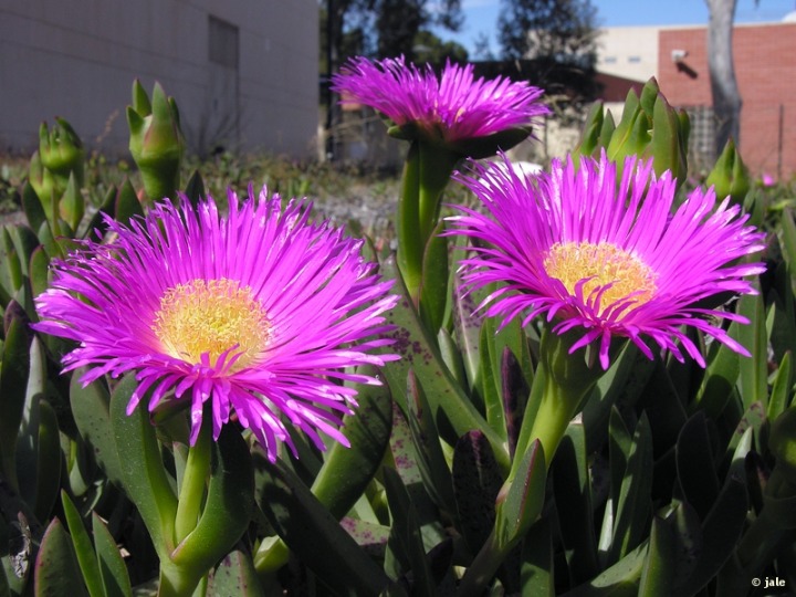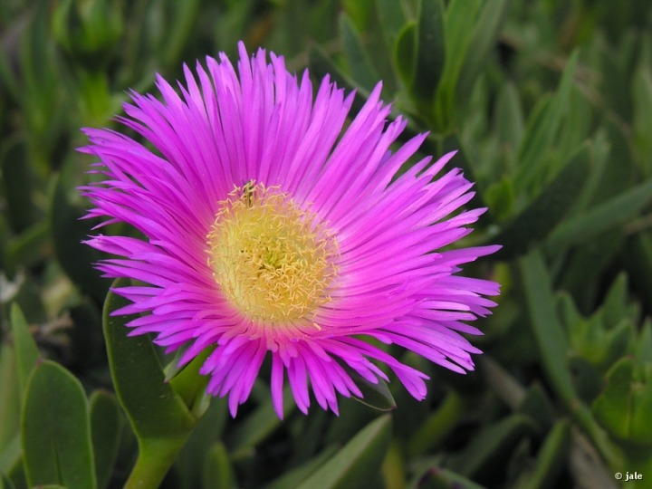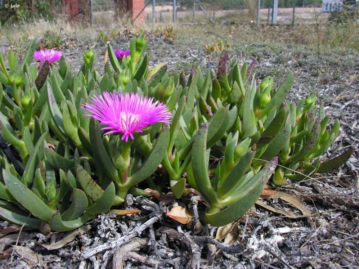 Mata perenne, de tallos suculentos, rastreros y ramificados, que alcanzan varios metros de longitud y enraízan en su avance. Hojas opuestas, falcadas, curvadas, gruesas, carnosas, de sección triangular, sin peciolo, que abrazan parcialmente al tallo, de extremo agudo y hasta 10 cm. Flores grandes, solitarias, de 7-10 cm de diámetro, en el centro amarillas, por abundantes estambres, y pétalos numerosos, filiformes, de color rosa intenso. Fruto de tipo drupa, carnoso, con semillas ovoideas, relativamente grandes, mucilaginosas.