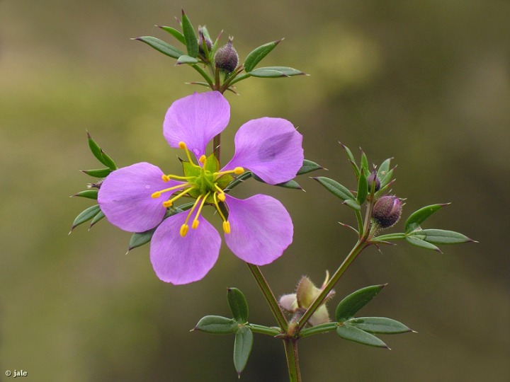 Mata perenne, raramente anual, erecta, con tallos ascendentes, de hasta 25 cm., pero de tendencia decumbente y hábito por lo general postrado. Ramificación particularmente intricada, con numerosas hojas trifoliadas, de estípulas espinosas y peciolo alado, con foliolos lanceolados y acuminados, rematados en apículo blanquecino y puntiagudo. Flores abundantes, solitarias, axilares, pedunculadas, de hasta 2 cm de diámetro, con simetría pentámera, de sépalos con espina apical y pétalos rosado violáceos, con uña clara y limbo redondeado. Estambres amarillos, de aproximadamente 1 cm., muy llamativos en el centro de la flor, que pronto muestran signos de marchitez y se presentan curvados. Ovario con cinco lóculos angulosos, algo piloso, que se transforma en fruto de tipo cápsula, con apéndice espinoso.
