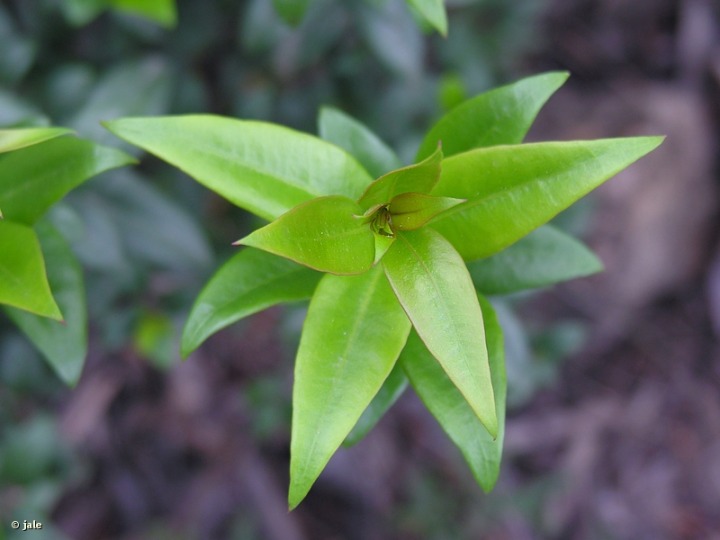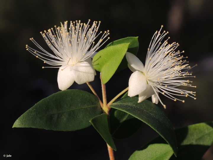 Arbusto perenne, siempre de color verde intenso y lustroso, de hasta 4 m de altura, ocasionalmente con talla algo mayor y hasta porte de pequeño arbolillo. Tallos muy ramificados, con ramas flexibles, parduscas, algo grisáceas cuando jóvenes, al estar entonces cubiertas de fina pilosidad. Hojas muy numerosas, generalmente emparejadas, que aparentan ser opuestas y decusadas, pecioladas, lanceoladas o bien oval-lanceoladas, de 3-5 cm de longitud. Flores pentámeras, de 2-3 cm de diámetro, axilares, solitarias, pero muy numerosas, con pétalos blancos, brillantes, redondeados, obovados, prontamente caedizos, sobre los que destacan un penacho fasciculado de abundantes estambres, muy finos, de hasta 1 cm de longitud, rematados en una pequeña antera de color amarillo pálido. Frutos (murtones) de tipo baya, globosos, ovoides, de 1 cm o menores, con restos persistentes de los sépalos en su extremo, muy oscuros cuando maduros, casi negros, con tonalidad azulada, color que es "enmascarado por un polvillo blanco-azulado".