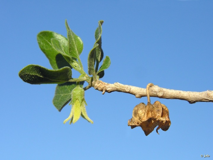 Arbusto muy ramoso, de hasta 2 m, que puede ser dioico y presentar pies masculinos y femeninos, con tallos sinuosos y torcidos, suberificados (de cubierta exterior engrosada y con tacto que recuerda al corcho), grisáceos o blanquecinos, verdes y pilosos cuando jóvenes. Hojas pecioladas, de limbo redondeado, a veces algo acorazonadas, cubiertas de fina pilosidad pubescente, más densa en sus primeros estadios de desarrollo, de habitualmente 3-5 cm de longitud o diámetro, que pueden tener coloración verde intensa (en épocas favorables) o verde amarillenta (en condiciones desfavorables). Flores solitarias, péndulas, por la escasa rigidez del peciolo, en ocasiones agrupadas en fascículos de 2-3, de aspecto campanulado, con cáliz de piezas soldadas triangulares, progresivamente filiformes, y pétalos de amarillo pálido. Fruto de tipo baya, subesférica, rodeada por el cáliz persistente, primero verde, después anaranjada o rojiza y –finalmente–negra.