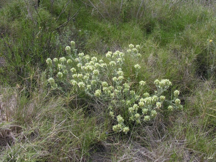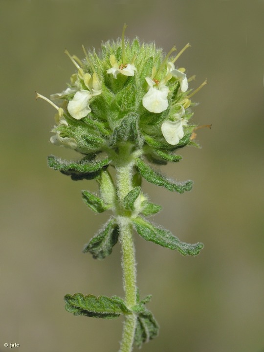 Planta sufruticosa, perenne, con tallos erectos, ascendentes, también –con frecuencia– decumbentes, de hasta 20 cm, con fino indumento de pelos (estrellados y simples, vistos a la lupa). Hojas opuestas, de lanceoladas a oblongas, con el margen revuelto, crenadas, de hasta 12 mm de longitud. Flores en cabezuela terminal, de cáliz inflado, con dientes de hasta 2,5 mm, triangulares, mucronados, el superior más ancho, y corola unilabiada, amarillenta, de 8 mm, con lóbulo central espatulado. Fruto de tipo núcula, redondeada, pardusca.