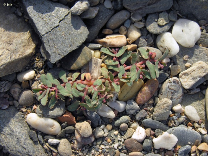 Herbácea anual, rastrera, postrada, con tallos reptantes, prácticamente pegados al suelo, que levantan apenas unos centímetros, ligeramente crasos, glabros, verde oscuros, rojizos en su senectud, que desprenden una sustancia blanquecina algo pegajosa al ser cortados. Hojas de contorno irregular, asimétrico, falcadas, con expansión a modo de aurícula en su base, sésiles, emparejadas, con nervio central marcado, de hasta aproximadamente 1 cm. Flores en inflorescencia típica de la familia (ciato), una “falsa flor” de aspecto globoso, pedunculada, compuesta por flor femenina central, en la que destaca un ovario peltado, rodeado de estructuras convergentes, que portan nectarios elípticos o reniformes, entre las que quedan comprendidos los estambres de varias flores masculinas. Fruto de tipo cápsula, ovoideo, redondeado, colgante, que contiene numerosas semillas, piriformes, provistas de pequeña punta en su extremo, de hasta 3 mm de longitud mayor.