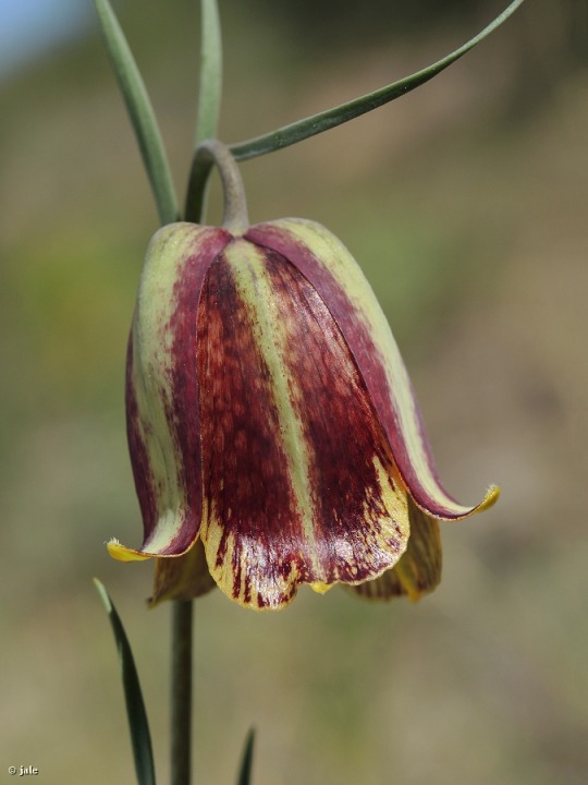Hierba perenne, bulbosa, con tallo único, de por lo general 20 cm de altura, hasta 50 cm, que presenta solo unas pocas hojas estrechamente lanceoladas, regularmente distribuidas, opuestas y alternas, verde grisáceas. Flores solitarias, raramente dos o tres, en racimo, con pedúnculo curvado en la floración. Corola ampliamente acampanada, de 2-4 cm de longitud y 2-3 cm de diámetro, verdosa o rojo pardusca, con franjas o, a veces, superficie de apariencia cuadriculada, que puede ser muy sutil o faltar. Fruto de tipo cápsula, elevada por un tallo ya totalmente recto durante la maduración.