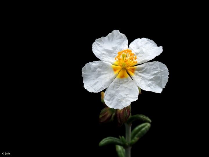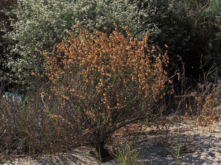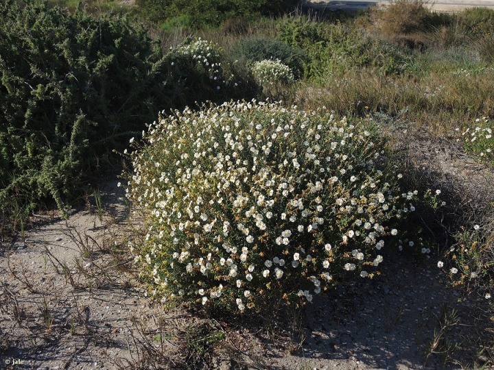 Pequeño arbusto o mata perenne, con tallos de hasta 40 cm, ascendentes. Hojas carnosas, opuestas, lanceoladas, cortamente pecioladas, con estípulas y mucronadas, blanquecinas por denso indumento de pelos estrellados y margen revoluto, de aproximadamente 1 cm de longitud y 2 mm de ancho. Inflorescencias muy numerosas, de tipo racimo, alargado, con hasta 10 flores pentámeras, de pétalos blancos, con base anaranjada. Fruto de tipo cápsula, con valvas abiertas, hirsutas.