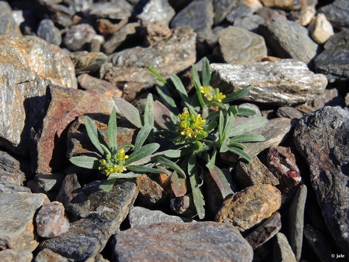 Planta herbácea, anual, de tallos o muy cortos y postrados, reptantes, pegados al suelo, de apenas uno o unos centímetros, o bien ascendentes, erguidos pero curvados, de hasta 30 cm, entonces incluso muy numerosos. Hojas de casi lanceoladas a linear-lanceoladas, más estrechas en la base, verdes, con nervio central más claro, cubiertas de pelos cortos dispersos, de 1-2,5 cm. Flores diminutas, agrupadas en racimos densos, con pétalos mínimos, amarillos, de 1-2 mm. Infrutescencia alargada, con flores cuando los primeros frutos, de tipo silicua, están inmaduros, muy característicos, de hasta 1 cm, cubiertos de pelos cortos y casi pegados a la superficie, finalizados en dos cortas expansiones triangulares, de 1 mm, que tienen apariencia de pequeños cuernos.