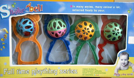La caja contiene cuatro sonajeros de plástico de colores.
