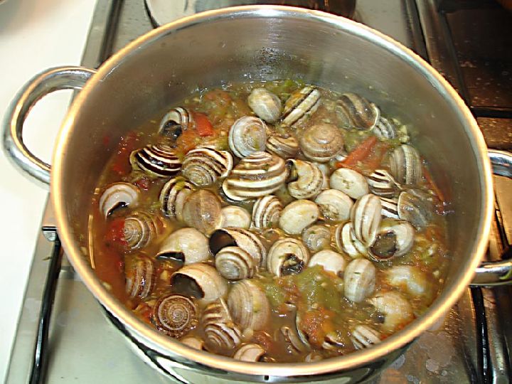 Seguidamente, para la elaboración de este guiso se deben cocer los caracoles en una olla con pimiento, tomate, sal y aceite de oliva durante un tiempo de entre 45 y 50 minutos, retirando la espuma que se genera al hervir.