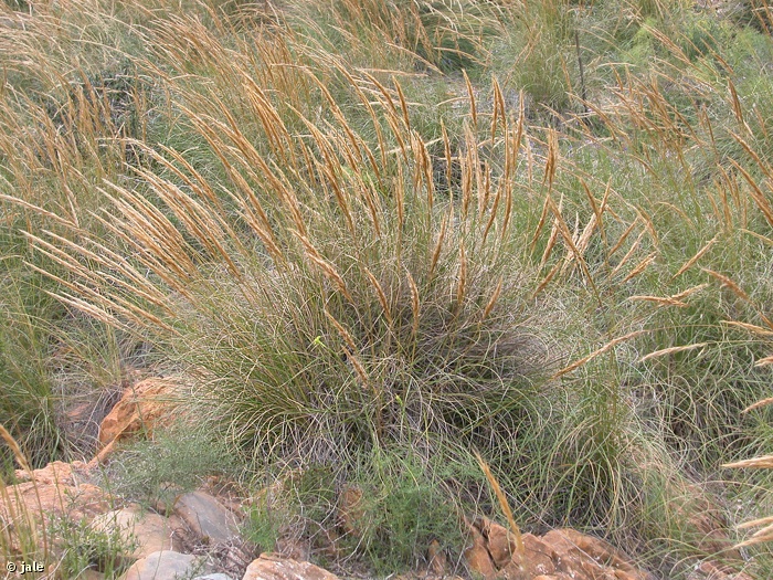 Arbusto perenne, herbáceo, alto, robusto, que forma macollas o "atochas" de hasta 1,5 (2) m de diámetro. Hojas numerosas, lineares y muy largas replegadas sobre si mismas, de aproximadamente 100 x 0,5 cm. Inflorescencia con espiguillas de 3-3,5 cm de longitud, agrupadas en panícula terminal compacta, con aspecto de espiga. Arista espiralada, de extremo truncado. Fruto seco, en cariopside, pelos y aristas persistentes en la fructificación.