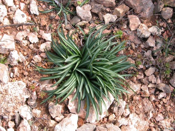 Comenzaremos a ver sus hojas acintadas tras la floración, en ocasiones incluso mientras ésta se produce, hasta bien entrada la primavera, tan características y fácilmente reconocibles por su franja longitudinal más clara. En los otoños lluviosos el haz de hojas es más numeroso y el tamaño de éstas considerablemente mayor, circunstancia que evidencia la adaptación de la planta a producir y acumular reservar en su órgano subterráneo durante las puntuales épocas favorables. A pesar de la vistosidad de sus flores, estas son demasiado pequeñas, efímeras y tardías, por lo que carece de nombre común de uso local en Murcia y allá donde se presenta [motivo por el que se la “bautizó” aquí como Flor de la estrella, en septiembre 2005, nombre que se ha extendido por páginas de Internet y documentos en papel, hasta en informes técnicos].