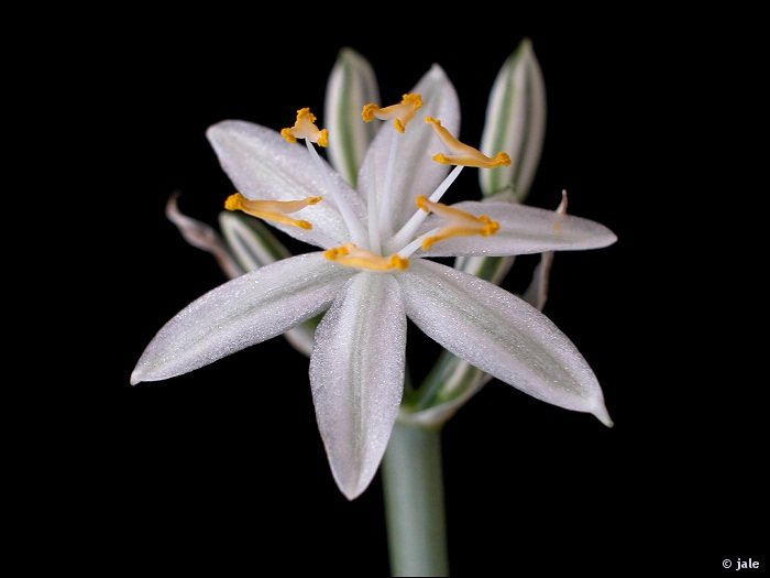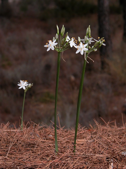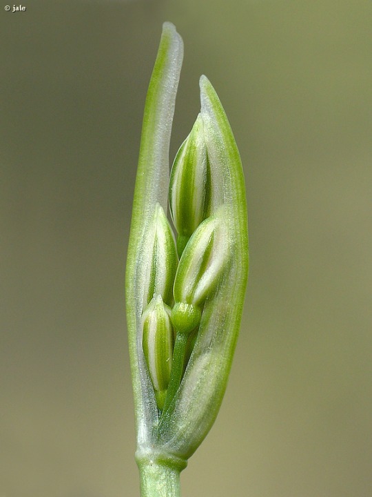 Pequeña planta herbácea, bulbosa. Órganos subterráneos habitualmente algo más largos que anchos, de túnicas membranosas, grisáceo parduscas. Raíces fasciculadas, blancas, de 1 mm o poco más de grosor. Hojas anchamente linear-lanceoladas, acintadas, verde oscuras, con franja media más clara, muy característica, ausentes durante la floración. Tallos de 15-30 (45) cm, aplanados, con estrías, girados sobre su eje hasta 90º, verde oscuros. Inflorescencia terminal, de tipo umbela, con dos brácteas papiráceas, membranosas, translucidas, blanquecinas o levemente grisáceas, subiguales. 5-15 (20) flores, de ovario infero. Tépalos blanco brillantes en su parte superior, con franja verde longitudinal por la inferior. Anteras sagitadas, sobre filamentos triangulares, alargados, soldados en su base. Ovario ínfero, estilo filiforme. Fruto tipo cápsula, con numerosas semillas subesféricas, algo irregulares en uno de sus extremos, de aproximadamente 2-3 mm de diámetro, negras.