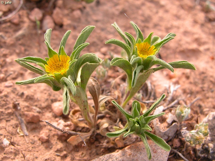 Pequeña planta perenne, rastrera, de tallos leñosos en su base, postrados, rojizos, de grisáceos a parduscos cuando secos, que pueden levantarse hasta 15 cm del suelo. Hojas de oblongo-lanceoladas a espatuladas, de extremo redondeado, cubriendo por completo los tallos, verde oscuras, pilosas. Flores numerosas, agrupadas en la inflorescencia típica de la familia denominada capítulo. Brácteas lanceoladas, verdes. Dos tipos de flores, flósculos en el interior y por el exterior las lígulas, amarillas, con pétalos externos alargados, a modo de expansiones, de longitud poco mas que las brácteas, patentes, con tres "dientes" en el ápice. Fruto tipo aquenio.