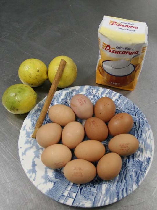 - En un cuenco profundo, se colocan las diez yemas de huevo. Se rompen y se mezclan, sin llegar a producir espuma. Luego se añade poco a poco el almíbar, que debe estar frío, para que no cuaje el huevo. Se mueve bien para que el conjunto quede bien mezclado.