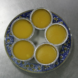 - Luego se vierten las yemas y el almíbar mezclados en el molde, a través de un tamizador para evitar que se cuelen grumos.