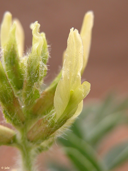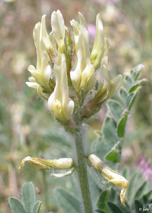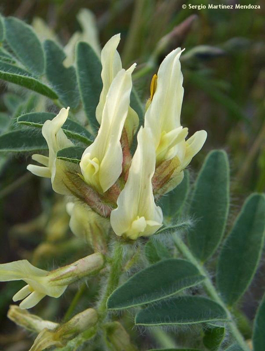 Hierba perenne, de longevidad limitada, con frecuencia anual o bianual, que alcanza 5 y hasta 7 años, con cepa lignificada (casi leñosa) y tallos de hasta 80 cm, por lo general erectos, aunque también algo tumbados, cubiertos de densa pilosidad blanquecina. Hojas de hasta 14 cm, imparipinnadas, con 10-12 pares de folíolos, elípticos o ligeramente truncados en el ápice, de hasta 20 x 9 mm, vilosos; estípulas de hasta 1,5 cm, soldadas a la base del pecíolo. Racimo denso, habitualmente de 20-25 flores, pedunculadas, de aproximadamente 2 cm longitud mayor, con estandarte (pétalo superior) amarillo pálido, quilla (pétalos inferiores) y alas (petalos laterales) amarillo-verdosas, mucho más cortas que el estandarte. Fruto de tipo legumbre, muy característica, por su forma navicular (que recuerda a una nave), sésil (sin pedúnculo) o casi, curvado y aquillado, de aproximadamente 2 cm de longitud.