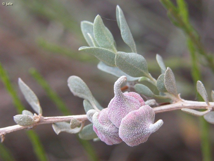 Arbusto monoico, perenne y alto, de hasta 3 m de altura. Tallos muy ramificados y enmarañados, lisos, algo agrietados, cenicientos o grisáceos. Follaje denso, con hojas de distribución alterna, ovado-lanceoladas, subrómbicas, de borde entero y algo onduladas, verde glaucas a grisáceo-blanquecinas, con nervios principales marcados en el envés, hasta 4 cm de longitud. Flores muy poco vistosas, de simetría pentámera, unisexuales, agrupadas en densos racimos con forma de espiga, de tonalidad predominante amarillenta. Frutos monospermos, de tipo aquenio, provistos de un ala membranosa blanquecina-rosada.